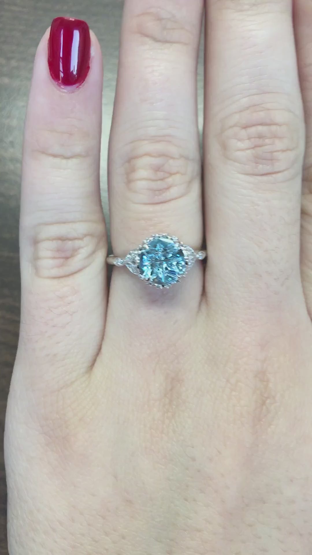 Our Shelby is white gold elegance and mystic wrapped into one.  She has a medicine Wheel Cut Aquamarine at her center that we know will make your partner's heart melt.
