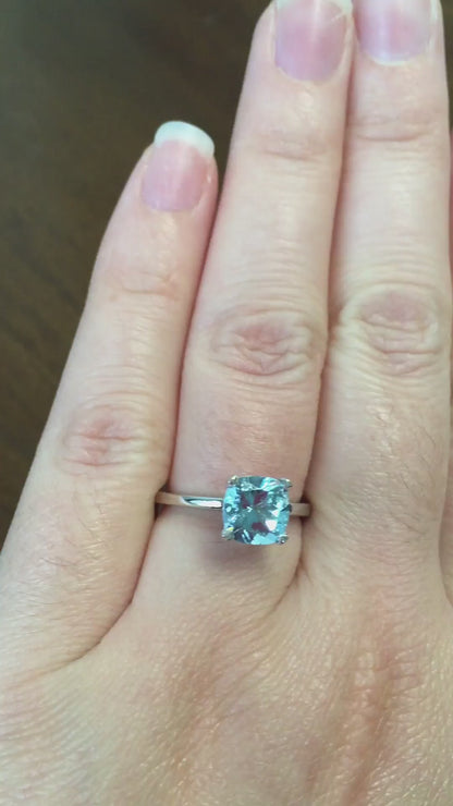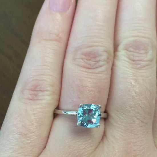 Here you have a beautiful - big - blue cushion cut 7mm aquamarine cushion on a classic 14k yellow gold band. Elegant, timeless and perfect. That's our Winifred.