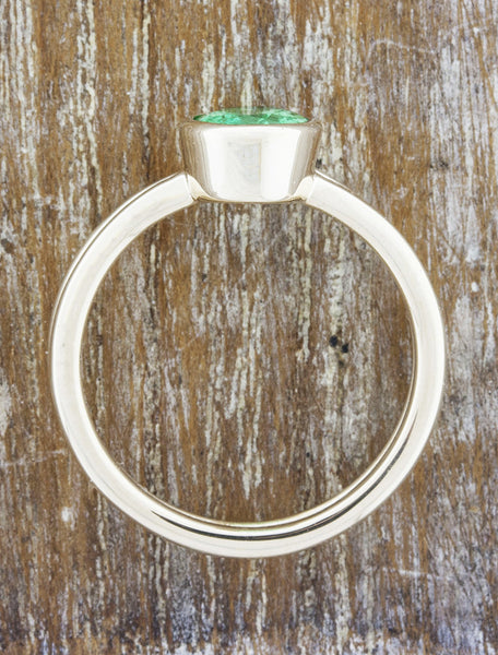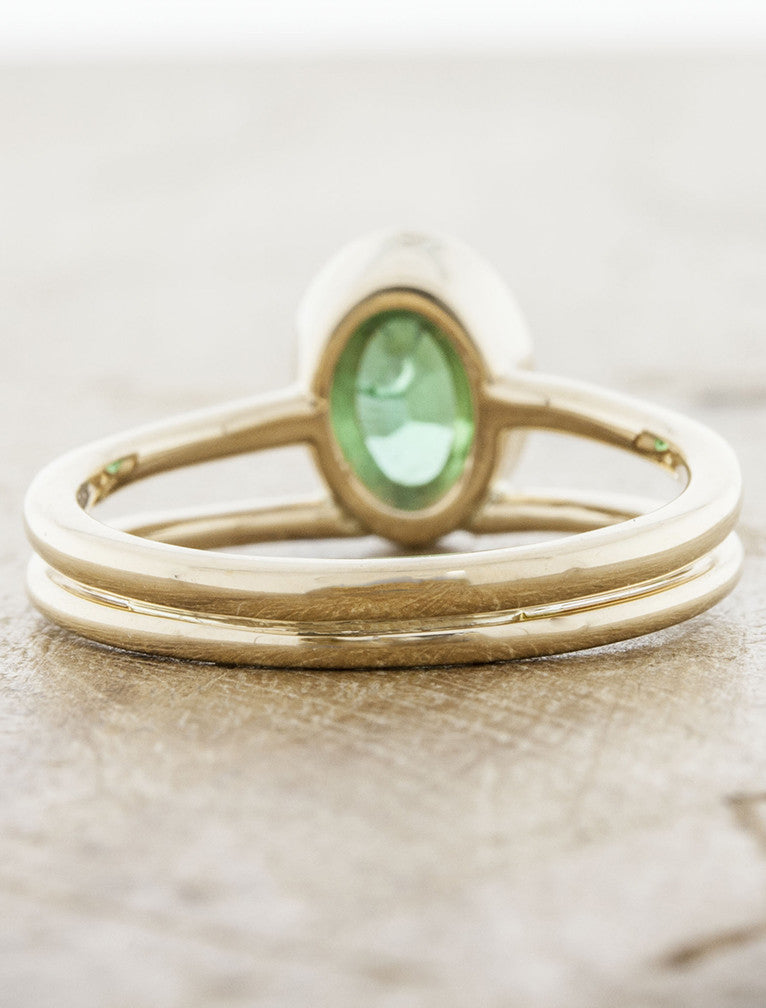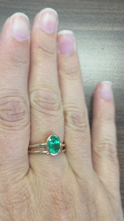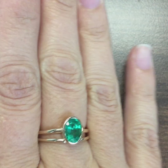 Make a bold yet refined statement with the Julianne - a chic double band split shank design that elegantly frames a bezel-set oval green emerald. This captivating solitaire setting blends architectural precision with vibrant color, delivering a modern twist on timeless romance.