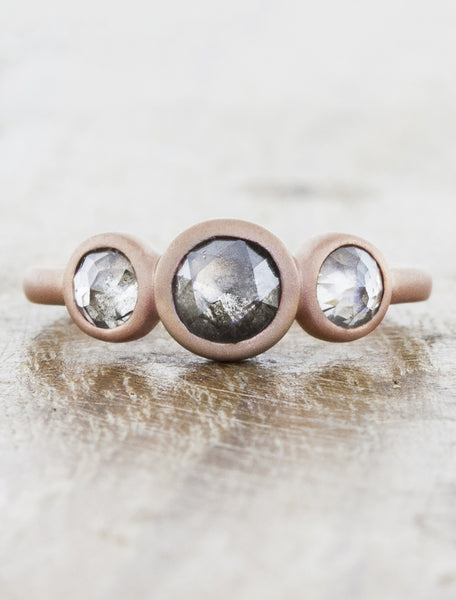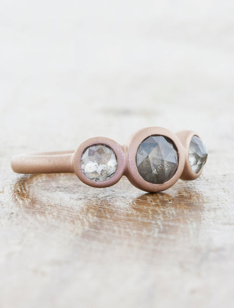 On the Grey you see three unique rose cut rough grey diamonds weighing a total of approximately 1.20 carats that are bezel set. Grey is shown in recycled brushed 14k rose gold. A sight to behold for sure.