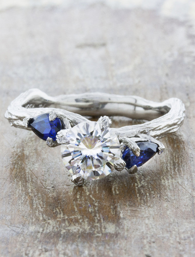 Inspired by our Aurora Three Stone, Bueti is our sculptural take on a traditional three-stone engagement ring. It features a unique wave-like band that flows into striking blue sapphire pear side stones to complement her round cut diamond heart.