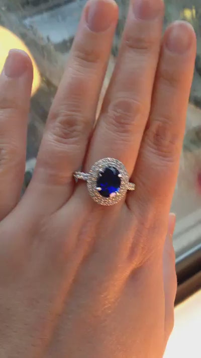 Shaye exhibits a sparkling 3.75 carat cultured, blue sapphire.  She's a deep blue - bold and beautiful.  The fascinating oval shape and checker board cut create a classic feel, while the deep blue color gives a sense of mystery. Much like our Camilla, Shaye features two glittering halos of diamond accents totaling 0.86ct in weight and is set in recycled 14k white gold. Handmade in NYC.
