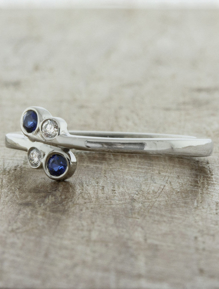 If she's fun, simple and always looking for something unique - then maybe - just maybe - Aleigha is just the ring for your partner.  She has true, blue cultured sapphires that hug two white diamonds in a small cluster.  Its an embrace that will last forever.  Its a dance that will never stop hearing the music.  Aleigha is really something special. Handmade in NYC
