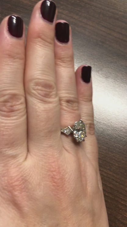 Julia is shown here with an exquisite oval diamond that is the heart of this masterpiece and to its right and left you see unbelievably brilliant kite shaped diamonds that we sourced specifically for this piece. This ring is final sale.