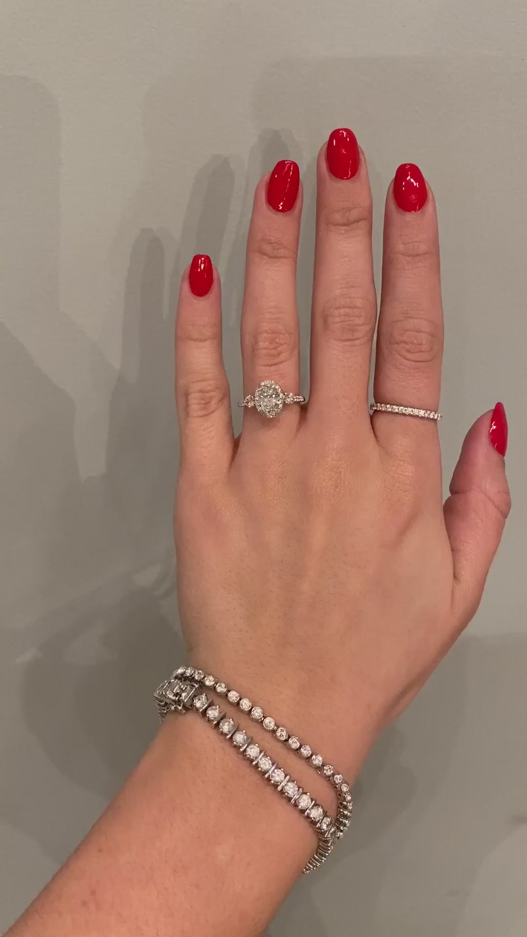 Sophie showcases an elegant oval center stone flanked by two round side stones, creating a timeless three-stone silhouette. A pavé band and halo enhances the design with shimmering detail, symbolizing a past, present, and future filled with brilliance.