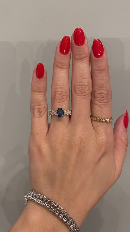 Barbara showcases an intricate vintage inspired design that has brilliant white diamonds set 3/4 of the way around the band, accentuating the blue oval sapphire at her center.  This design is the perfect combination of vintage chic and glamour.
