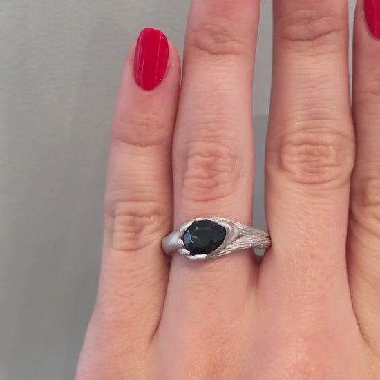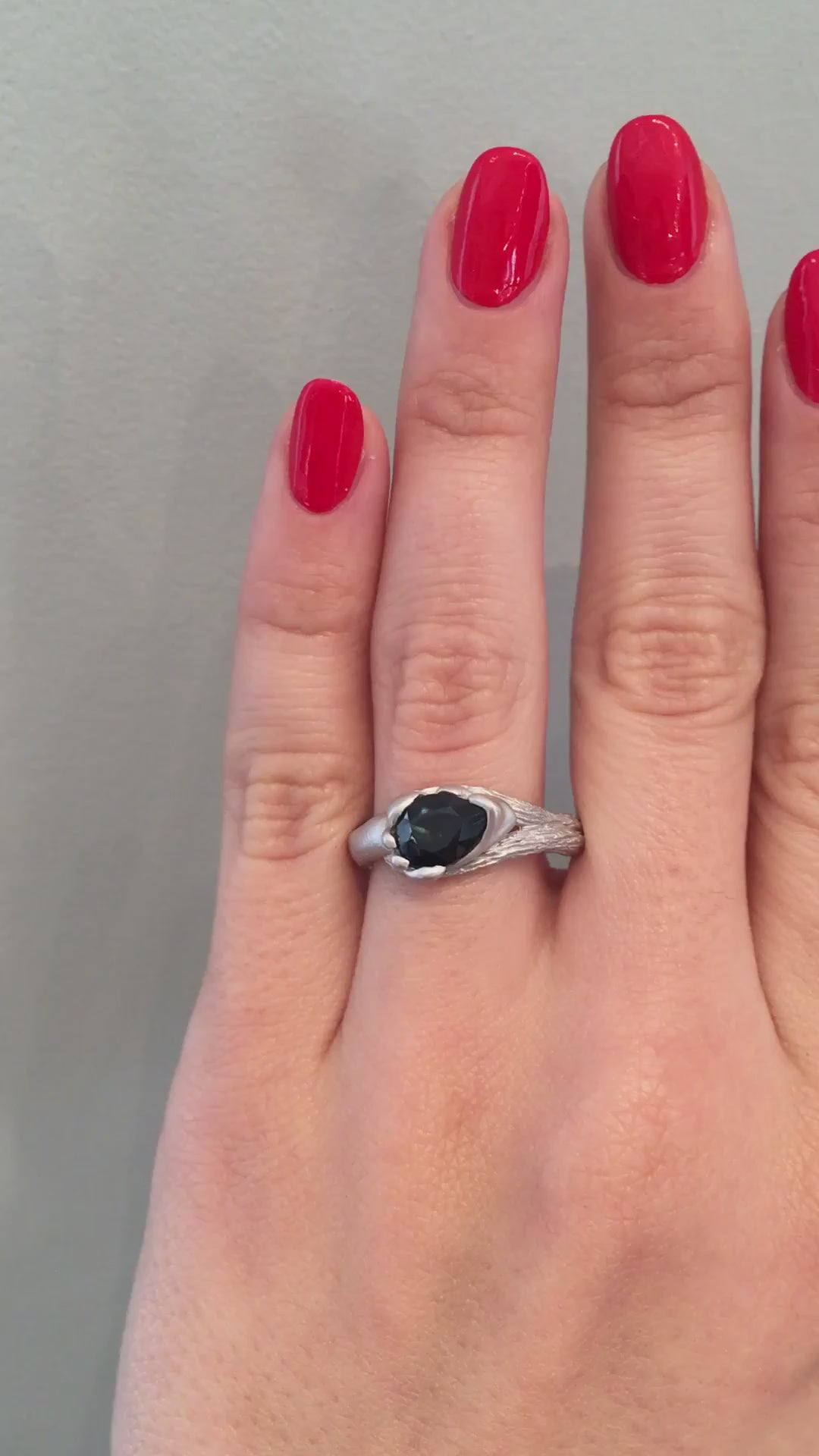Luli combines the art of sculpture with a beautiful pear shaped sapphire we sourced for our client who sought something unique, designed and elegant.  On this piece, we hand engraved a design that mimics the life on the bark of a beautiful, Sequoia tree - inspired by a trip to the magnificent Sequoia National Park in California. She pairs beautifully with the Bella wedding band for a unique bridal ensemble.  Handmade in NYC.