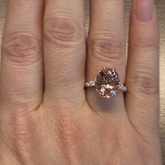 Francine is made in a gorgeous 14k rose gold recycled metal with a geometric band that is sprinkled gloriously with brilliant white diamonds.  We sourced an oval morganite for her heart and surrounded her with two round diamonds on either side.