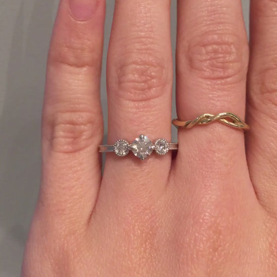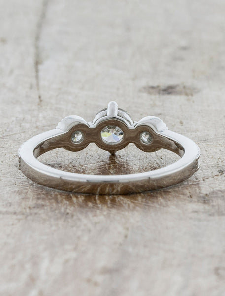 Claritza is a work of love and art made in platinum.  She oozes vintage flair that is hard to resist. She holds 3 bright, white round diamonds in a horizontal position that commands attention.