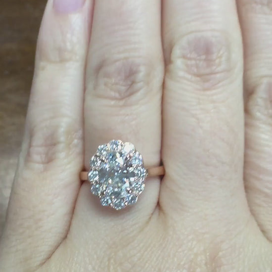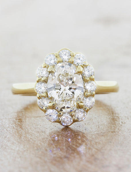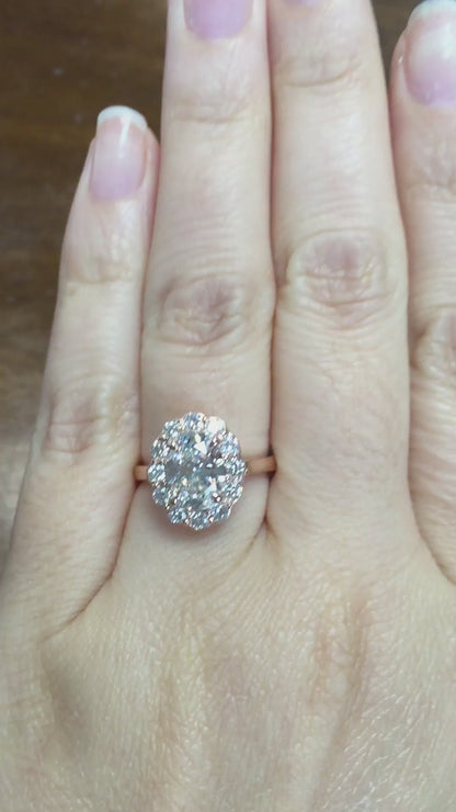 Tracey is love - she is pretty in pink.  Her brilliant oval diamond glistens in any light.  The adorned basket caressing the diamond is full of surprises at every nook. It is covered with intricate hand carved detail in a manner that is flowy and continuous like the love this couple has for one another.