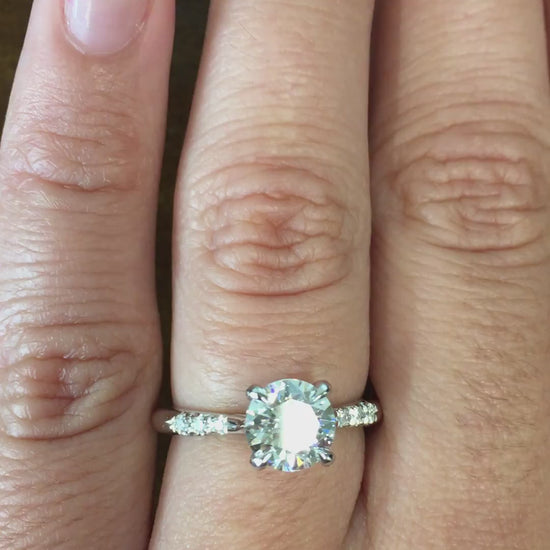 An engagement ring with vintage flare, class and lots of sparkle. The subtle details around the stones on the Toomey make her extra exquisite. Toomey pairs beautifully with our Abby wedding band.