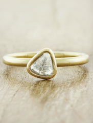 Mettie steals your heart at first glance.  She cradles a free form shaped-natural rose cut, rough diamond  which is nesting in a delicate looking 14k yellow gold bezel trim. Full documentation accompanies this beauty.  She is  a one of a kind - don't let her pass you by. Handmade in NYC.