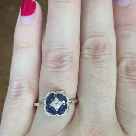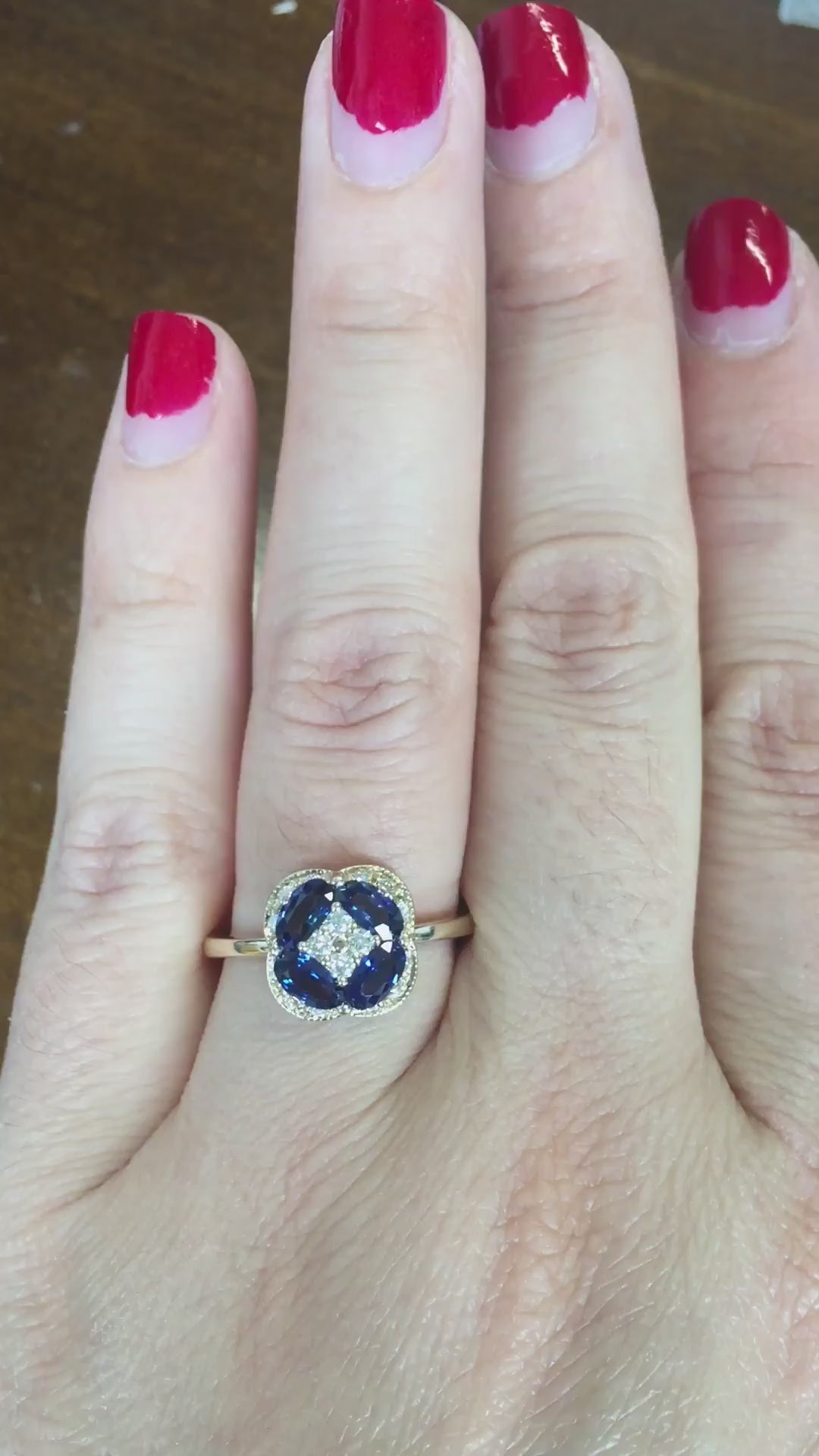 You will immediately be drawn to this ring. She just draws you in. Her look makes us think of an art-deco style tulip. Finely crafted in 14k yellow gold and  accented with 0.21 carats of sparkly white diamonds, her design makes us think of an art-deco-style tulip.  She is set with beautiful, blue sapphires. Perfect as an unconventional engagement ring with artistic flourishes.
