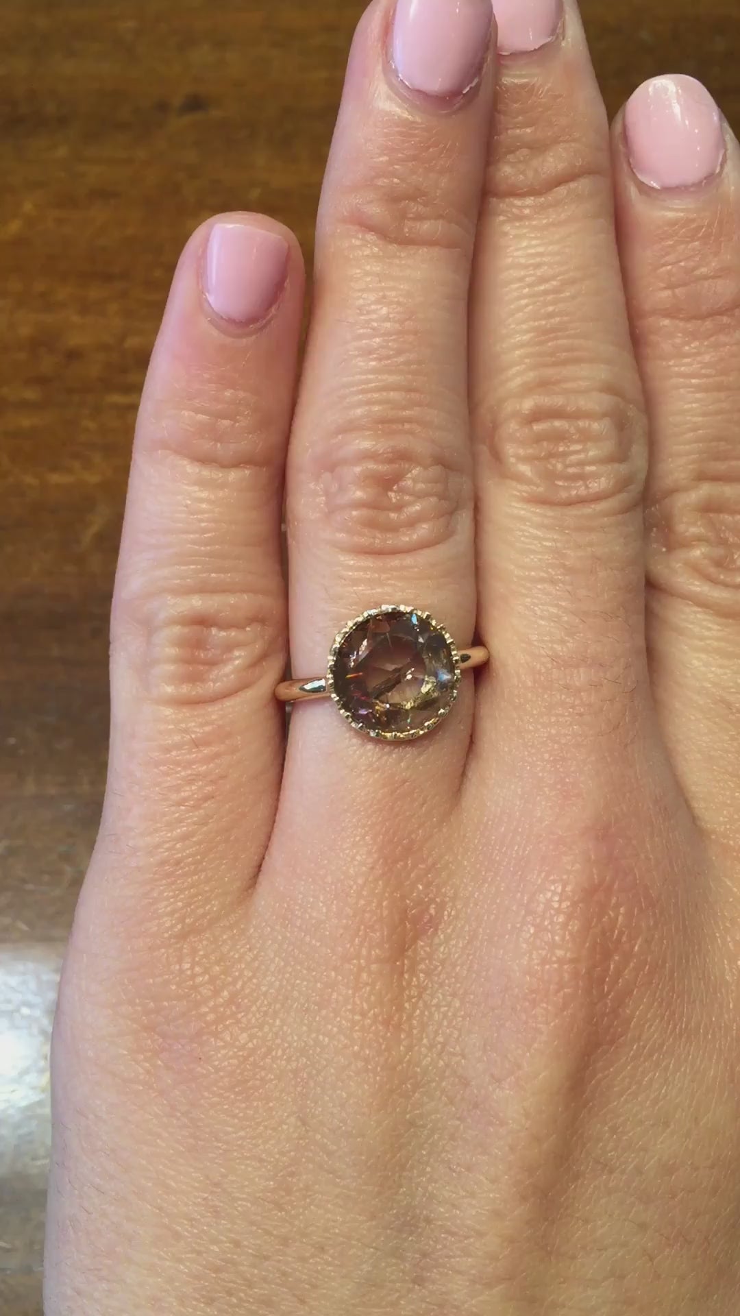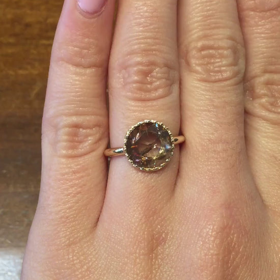 Lori in 14 Yellow Gold is something beautiful for the love of your life.  We sourced an exquisite Cognac rose cut diamond that is nothing but pure wonder.  The basket protecting the stone is handcrafted with a special detail. All the way around this piece runs an unbroken line - with no beginning and no end - just like true love - something meant to be that lasts forever.
