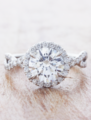 Vicky is a beautiful ring that incorporates the infinity symbol.  An amazing round cut diamond sits like a queen in the center of this band - set in a classic 4-prong setting, but with a sparkling halo at her heart.