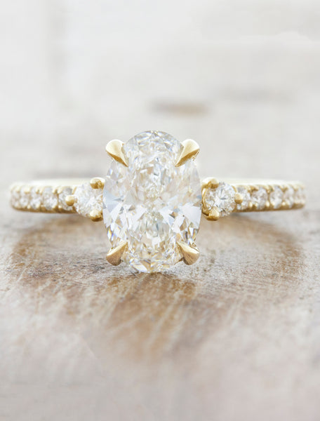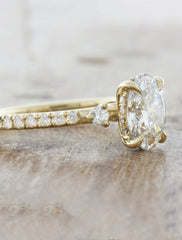 A simple yet beguiling ring, our Lucia features a beautiful 1.34ct D color VVS2 clarity oval lab grown diamond in a four prong, 14k yellow gold recycled metal setting with diamonds partway along the band. She is beautifully classical.