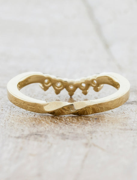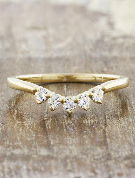 Kiki features a gently contoured and twisted design, delicately shaped to complement your engagement ring. Adorned with five sparkling round-cut diamonds, it beautifully crowns your stack, adding a touch of timeless elegance and brilliance.