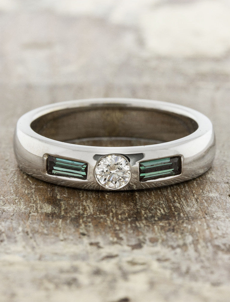 The 4mm Marcel is one of our newest wedding bands.  It's smooth and sleek for the person who wants a timeless classic. It comes in a high polish or brushed finish at 4mm. To add a little something of cool and funky we set two lab grown alexandrite baguettes and one round brilliant lab grown diamond at its core.   Handmade in NYC.