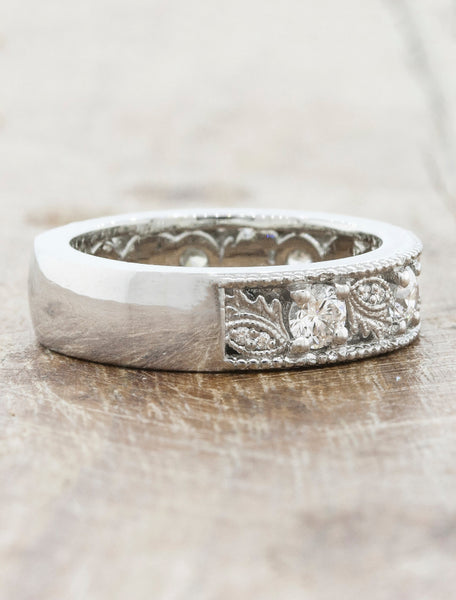 Quin exhibits an intricate vintage inspired design that runs more than halfway around a 5mm band with white diamonds set within the features of the band.  Within the design is an oak leaf detail from our client's home country that he wanted to incorporate into his wife's ring.