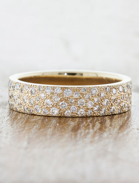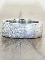 The 8mm Cisco is our newest men's wedding band.   It is hand-textured, with each curve and carving working together to create a lustrous style. Added to this texture are over 125 conflict free round diamonds that make a statement and keep things classy halfway around this recycled platinum band.   Handmade in NYC.