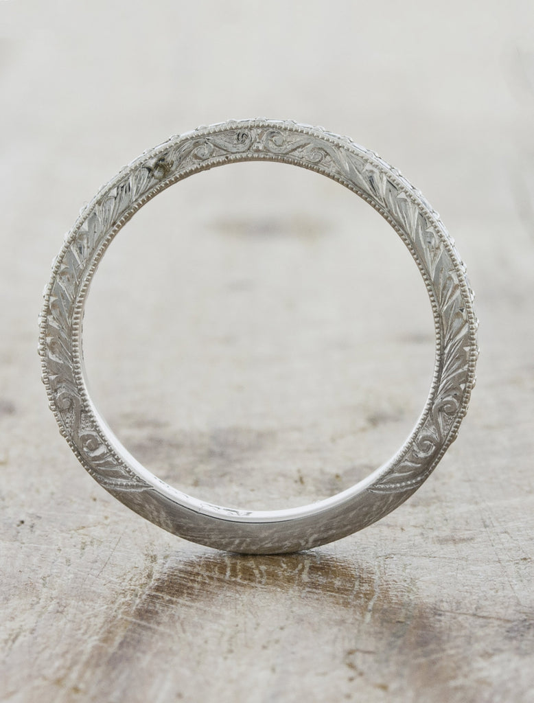 Sedna features a gentle pavé curve, adorned with delicate hand-engraved scrollwork along each side for an ornate vintage appeal.