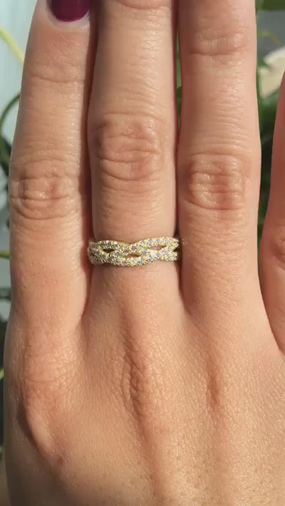 Miki features a stunning braided design with a brushed matte finish, offering a modern yet timeless appeal. Delicate diamond accents are subtly scattered throughout the band, adding a touch of sparkle and sophistication to this elegant piece. Perfect for those seeking a unique and refined symbol of love.