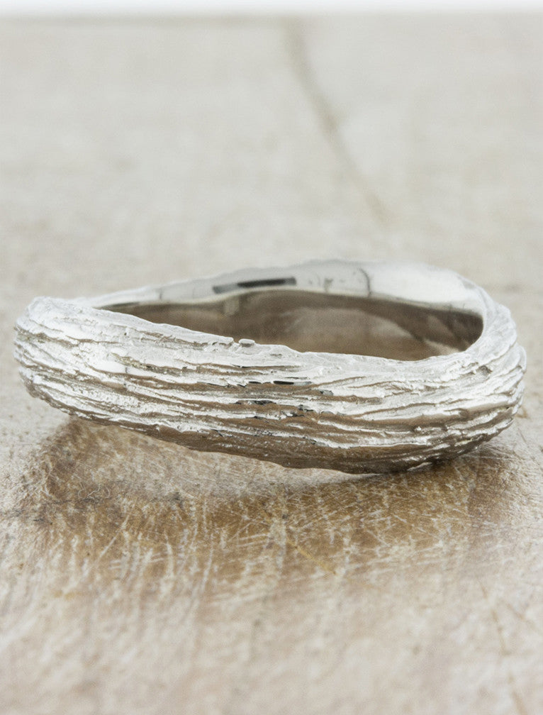 Tilt features a unique band that fits comfortably on the finger in your choice of recycled metal. Inspired by a trip to the Sequoia National Park in California, we hand engraved a design that mimics the life on the bark of this magnificent tree and curved the band for an extra unique look and comfortable fit.  Our Forrest is similar in style, but without the curve in the band. Handmade in NYC.