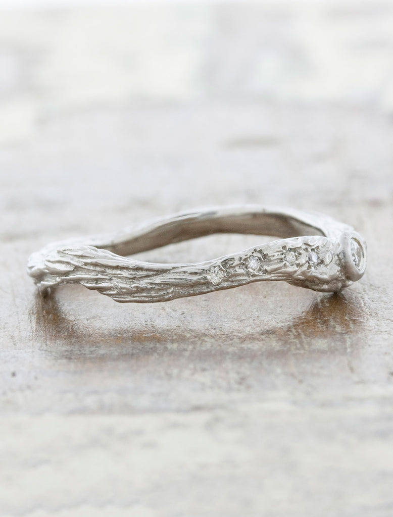 Inspired by our Siduri, Mia flaunts our signature hand-engraved bark texture for an added organic element to her contoured, asymmetrical band. A bezel set round diamond sits at her heart with a sprinkling of smaller diamonds along her band.