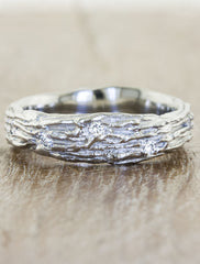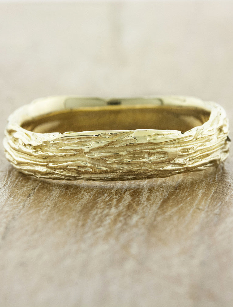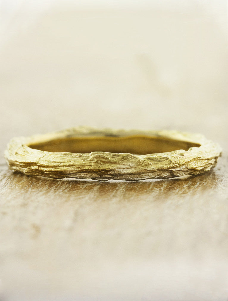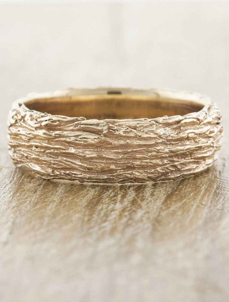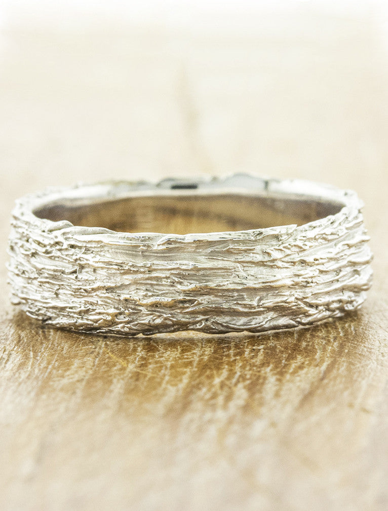 Forrest is a unique textured wedding band that fits comfortably on the finger in your choice of recycled metal. Inspired by a trip to the Sequoia National Park in California, we hand engraved a design that mimics the life on the bark of this magnificent tree. Handmade in NYC.