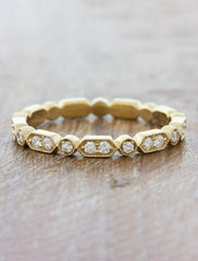 Elanor is a wedding band adorned with an intricate vintage inspired design that goes 3/4 way around her band with sparkling white diamonds set within the features of the band.