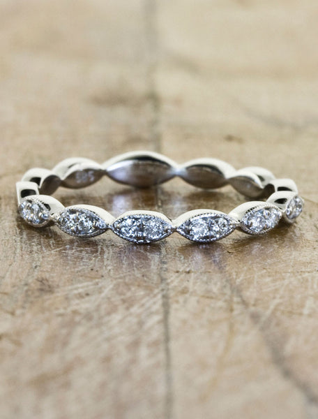 Natali has a vintage inspired design that runs 3/4 of the way around her intricate band. It will remind you of soft, caressing waves on a warm day at seaside.