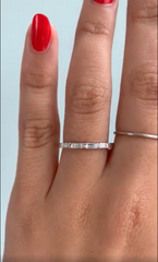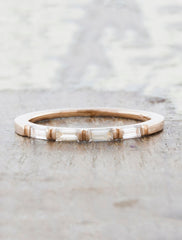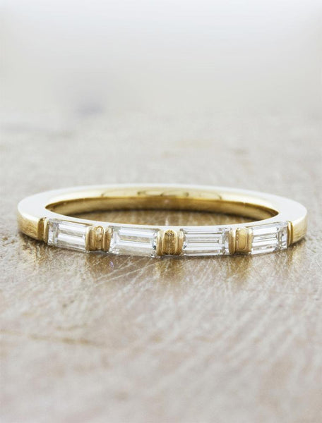 Lexus is a wedding band adorned with sparkling baguette shaped, white diamonds set half-way within the features of the band.