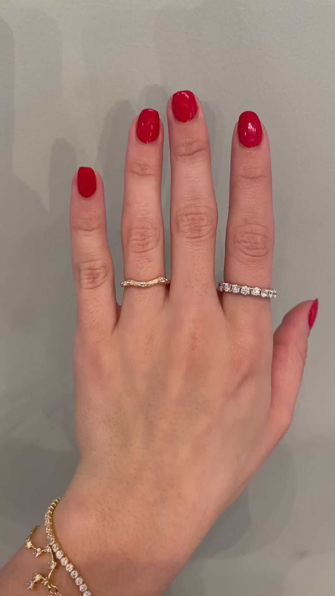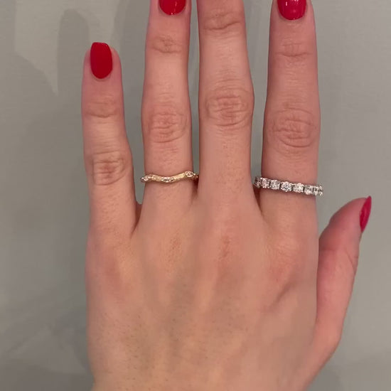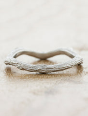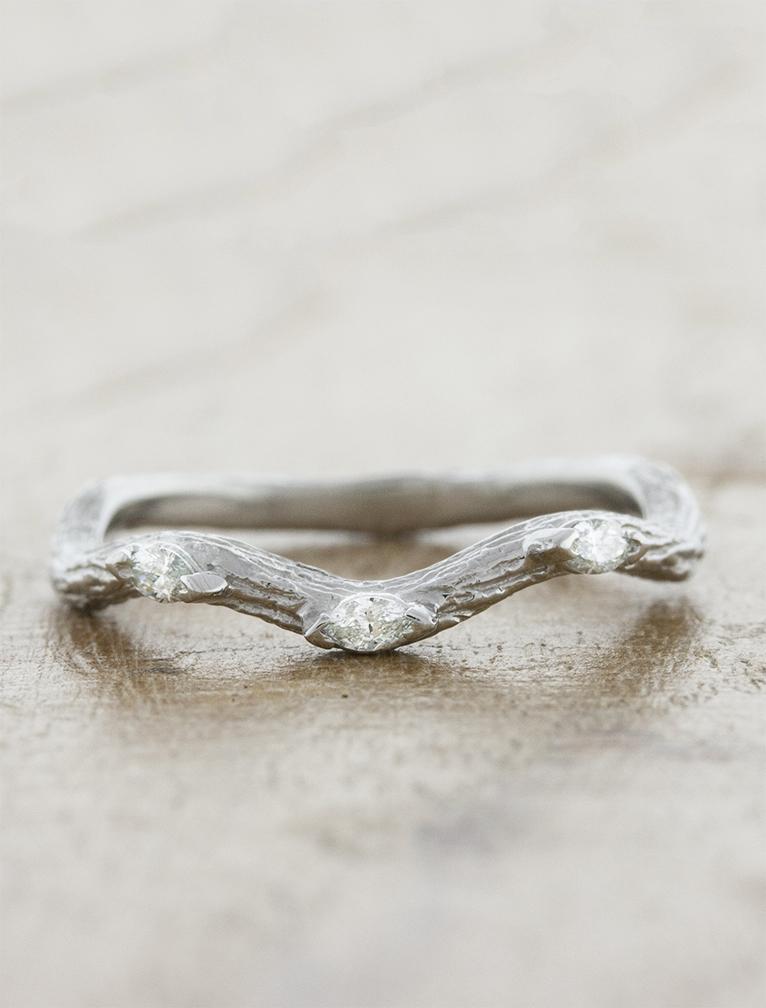 A complete wedding band with nature inspired flare and lots of sparkle.  The subtle details depicting a journey in nature make the Belkis so special.  Her marquise diamonds add a unique element to this marvelous design along with the hand engraved bark texture.  She pairs beautifully with our Louella.