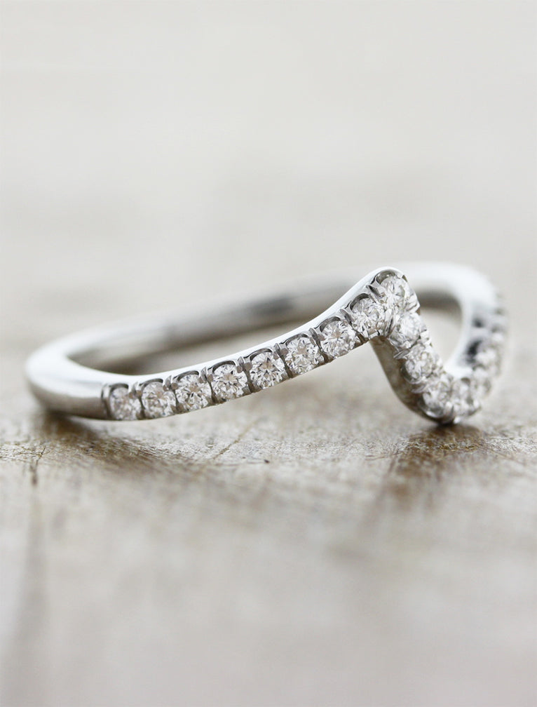 Ziggy is a brilliant wedding band sprinkled gloriously with white diamonds halfway around the band.  She will wrap you up and make you fall in love with her.  She just can't help herself. She is great to pair with an engagement ring that has a large center or lays flat on the hand like our Lorax. Handmade in NYC.