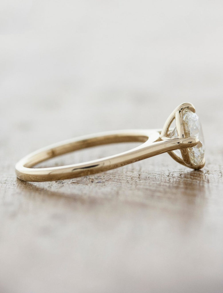 Martha features a chic minimalist design with a thin band and graceful cathedral setting that subtly lifts the center stone for added presence. Its clean, refined lines offer a timeless expression of simple elegance. Her 4 compass set prongs add a hint of pizzazz