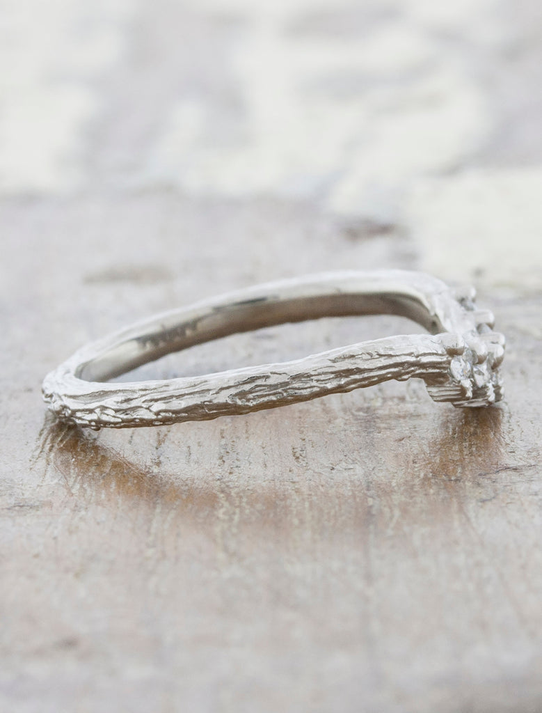 Lee is the crown for your queen.  It features an elegantly contoured band with 0.15 tcw prong-set diamond accents and a 2mm wide band covered in our signature bark texture. Pairs beautifully with the Adelia and  Pembroke.  Handmade in NYC.