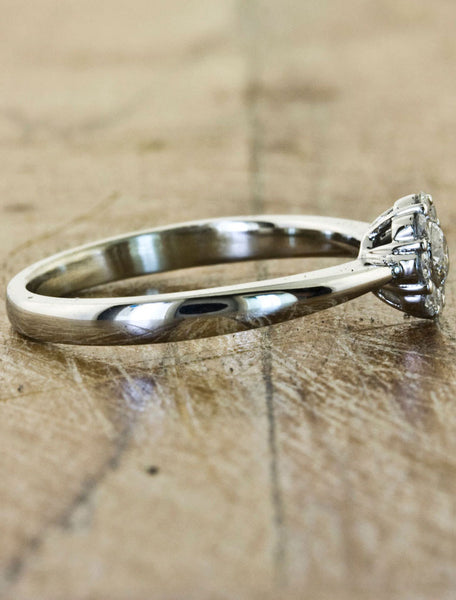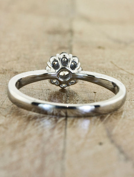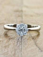 The Veronica features a cluster brilliant round diamonds approx 0.21ct in an 14k white gold setting.  At first glance, this piece looks like one large diamond solitaire.  However, upon closer examination you see that one brilliant diamond is surrounded by a halo of slightly smaller diamonds.  This unique diamond ring is perfect for someone who loves the look of a diamond solitaire, but with a modern update.