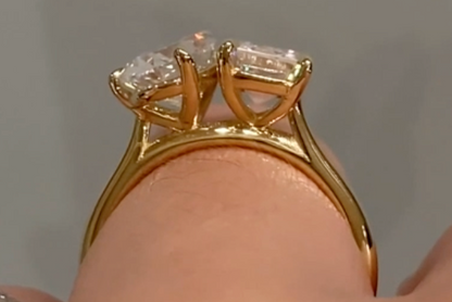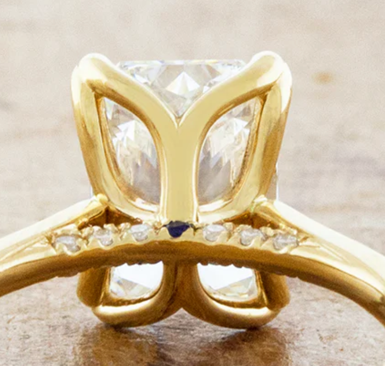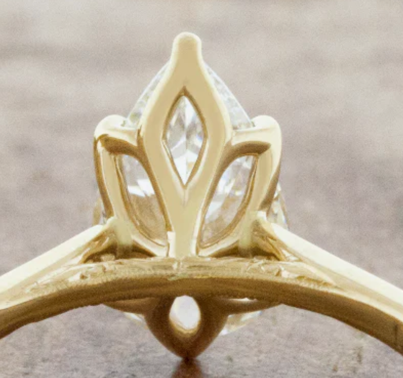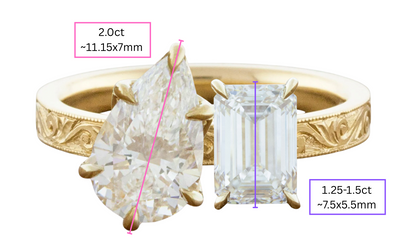 Design Details: Design piece with Esmeralda's engraved band. High profile, cathedral setting (ref side view image). Pear set with a 5-prong tulip basket, emerald cut with a 4-prong tulip basket.