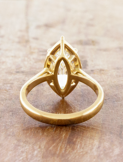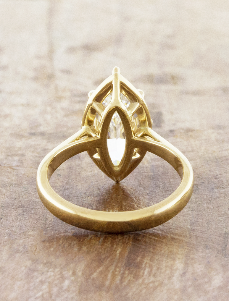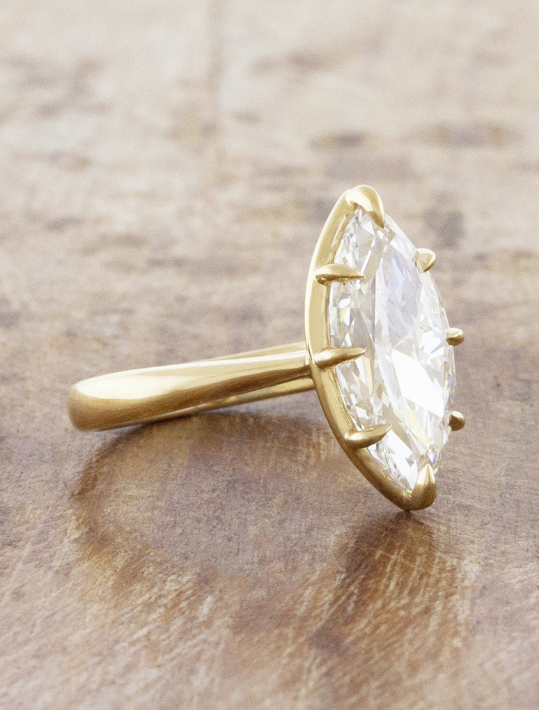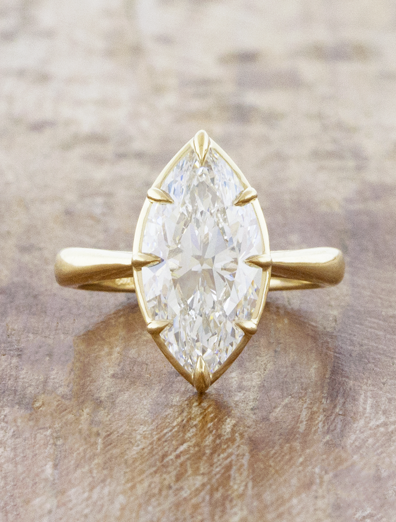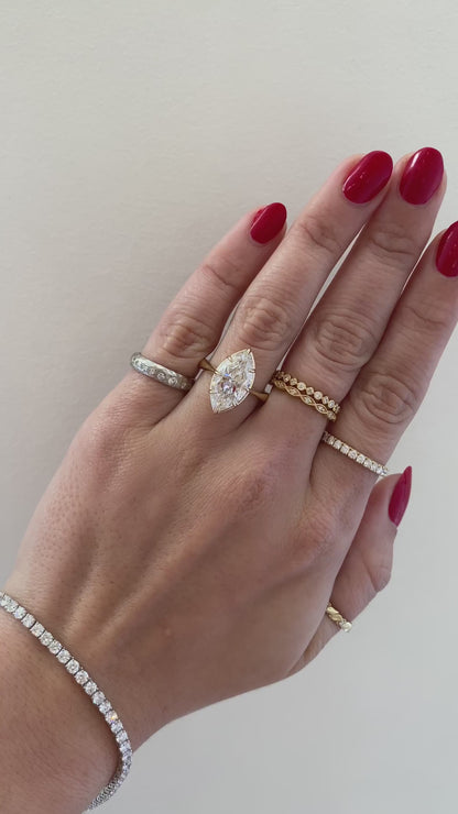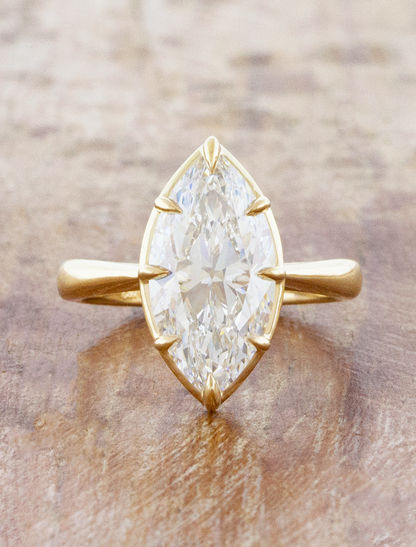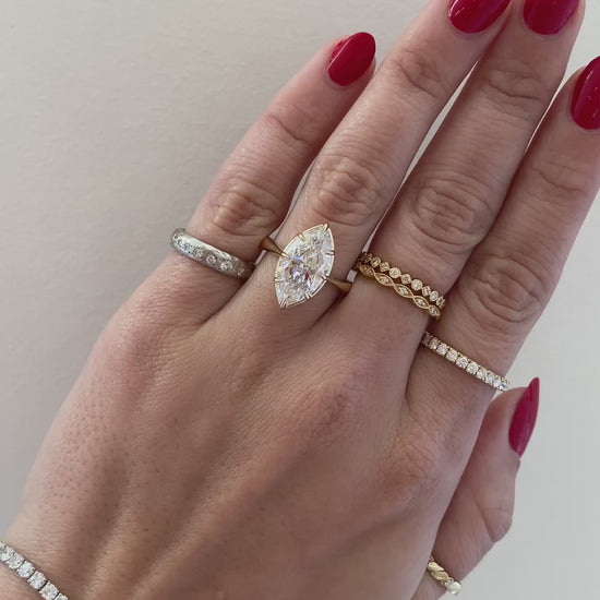 Wynn is a statement of contemporary elegance, featuring a sleek tapered band and visible gallery that evokes a bezel-inspired silhouette. Her 8 claw-like prongs secure a gorgeous marquise centerpiece commanding attention with effortless style.
