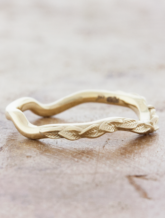 Asymmetrical leaf engraved wedding band