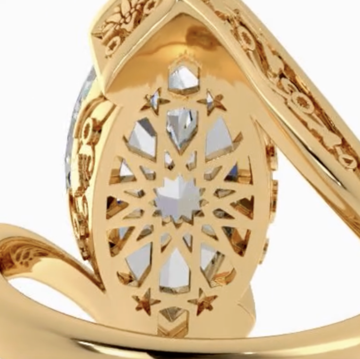 Design Details: Reference Cus Salomé w/ prongs for structure (4 prongs). Incorporate Phoenix texture on the bottom band, ending approx. halfway around the underneath. Add metalwork underneath the center stone.